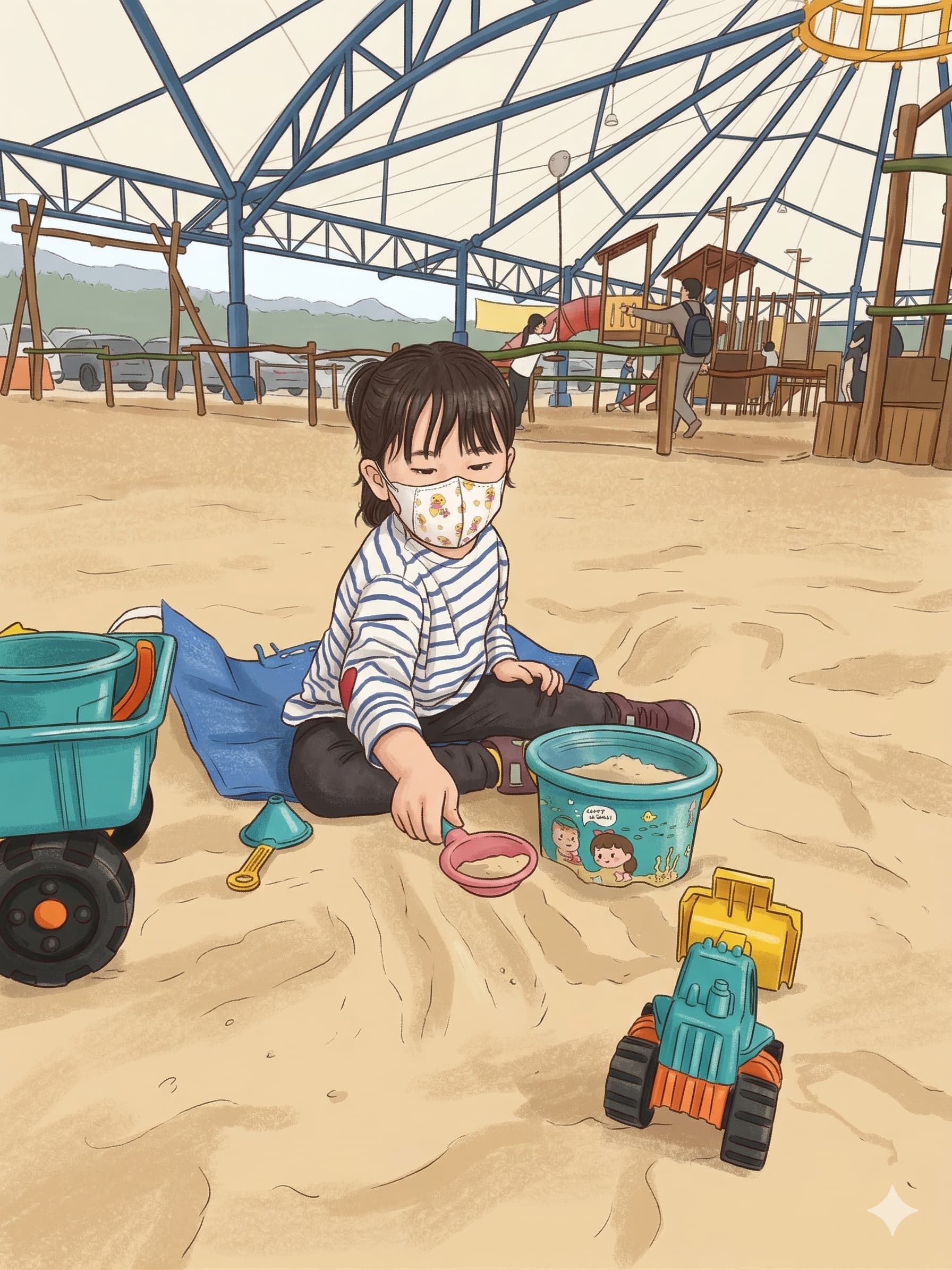 돗자리를 펼치고 장난감을 꺼내놓는 순간, 아이가 뛰었다. 말 그대로 뛰었다. 실내가 아닌 야외에서 하는 모래놀이는 거의 처음이었다. 언니 오빠들에게도 "안녕~" 하면서 자연스럽게 어울렸다. 사람 적응이 빠른 아이라 늘 고마운 부분이다.